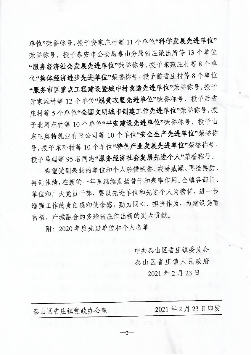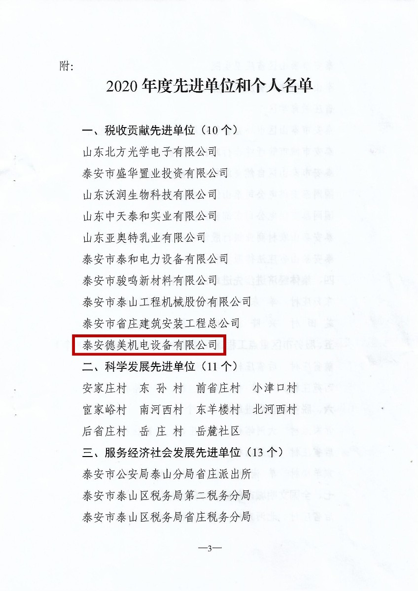 近日,中共泰山區省莊鎮委員會(huì )、泰山區省莊鎮人民政府為突出貢獻的2020年度先進(jìn)單位予以表彰。共10家企業(yè)獲評“稅收貢獻先進(jìn)單位”,泰安德美機電榜上有名。