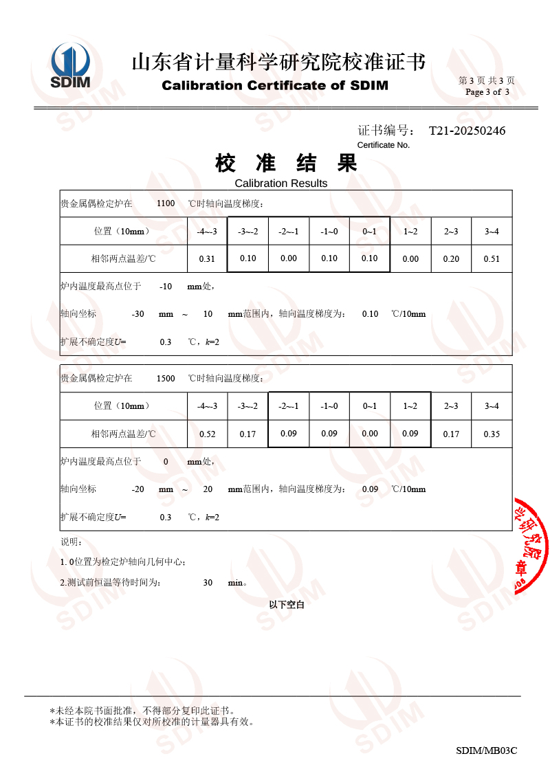 高溫貴金屬熱電偶檢定爐(800-1600℃)校準證書(shū)