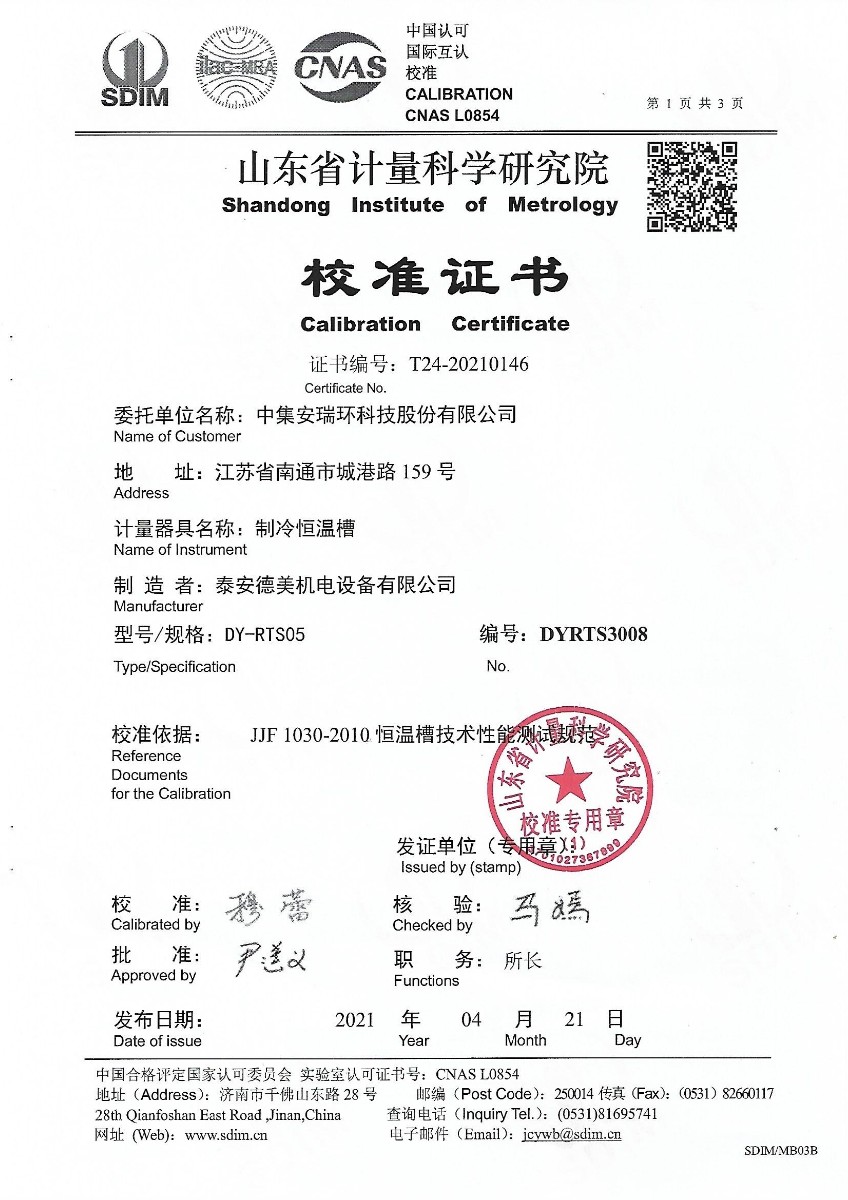 | 上一條:中集安瑞環(huán)科技股份有限公司-高精度恒溫水槽 | 下一條:便攜式溫濕度檢定箱(-10-60℃)校準證書(shū) |