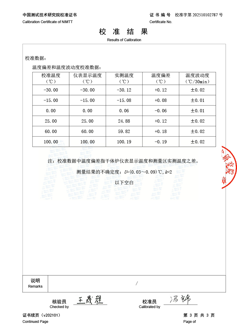 便攜式干體爐(-30-150℃)校準證書(shū)